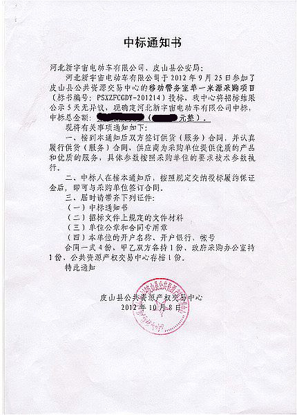 河北新宇宙電動車公司新疆皮山縣中標通知書